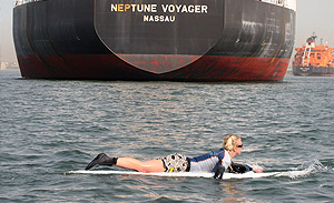 Yesterday's port swim felt like something out of the imagination, a surreal slow-motion navigation through moving cargo ships, anchored oil tankers, and a sense of being a mute spectacle. Although my left shoulder hurt from tendonitis, the continuous diesel fumes throughout the port made me feel sick, and at one point I was fatigued, my greatest challenges were mental. Around mile 9, I noticed a tall building on the coast. Every time I turned my head to the left to breathe I could see that same building. Breath after breath its location did not change. Was the current suddenly against me? I became sure that I was not moving, and through anger and frustration I kicked harder and moved my arms faster. But my swimmers temper tantrum was not getting me anywhere, and I could still see that same building. It was at that point in the swim that I realized that swimming is a slow form of transportation and I must engage in the experience rather than fight it. I had to forget about our faced paced culture for a moment and enjoy the view of the building on Ocean Boulevard. If I could not do this, I wasn't going to finish. This is what it feels like to not drive.