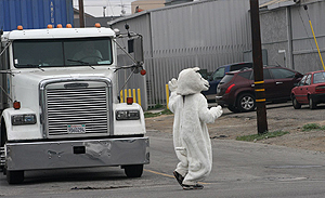 Yet when I thought about it, there's really nothing happy about a sweaty running polar bear. As the main icon for global warming, polar bears are drowning to extinction and most likely would not end up searching for a life in Wilmington. But as with any species, including humans, loss of habitat often leads to either extinction or a migration to the city. In this case, a lone Supercommuting polar bear somehow washed up on the shores in the Port of Los Angeles and had no alternative but to start running. And then drink a Coke.