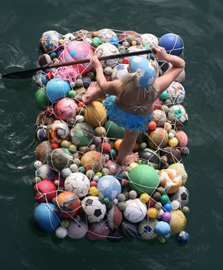 Flotsam Jetsam consists of a raft constructed out of 450 balls I collected on 3 separate jogs over a 3-week period in the Bolsa Chica and Los Cerritos wetlands located in the Long Beach area. Dressed in a costume made entirely of balls, I stand-up paddled the raft 2 miles from Los Cerritos through Alamitos Bay to the ocean. In addition to concerns with coastal pollution and the consumption apocalypse-to-come, the piece deals with ideas of delusion, fantasy, and kinetics. Aqua-planing off stereotypes of island cast-aways, Flotsam Jetsam details a desperate young girl's flight from the broken sump of the LA basin. Stranded in an urban setting she strikes out alone toward a horizon cluttered with oil tankers and yachts on a craft made of washed-up balls abandoned in the wetlands.