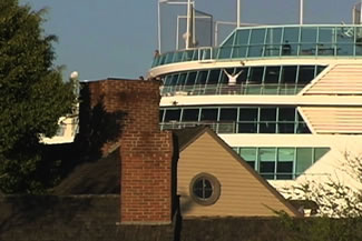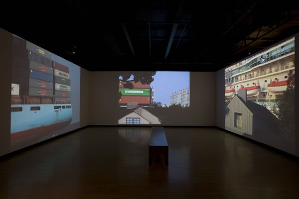 Import, a series of videos of container ships, oil tankers, and extravagant cruise ships from the ports of Los Angeles, Long Beach, and Tokyo, addresses the relationship between the current global economy and the postcolonial legacy of international trade. These ports are at the heart of consumerism. The scale is grand and the movement is fast-paced and expansive.