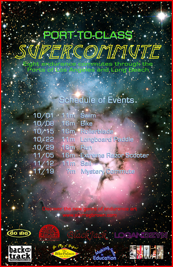 The Port-to-Class Supercommute is a performance modeled after a sporting event. The project will take place over a seven-week period, starting Monday, October 1st and ending Monday, November 12th. For seven consecutive Mondays I will be commuting at 7:00 a.m. from my residence at Berth 75 marina in San Pedro, to Long Beach State University for a 7:00 p.m. class, allowing 12 hours to complete each event. The seven methods of transportation will consist of, in this order: swimming, cycling, rollerblading, paddling, extreme razor scootering, running, and sailing. The commutes will cover a 16 mile land route and a 12.5 mile ocean route.